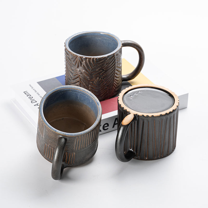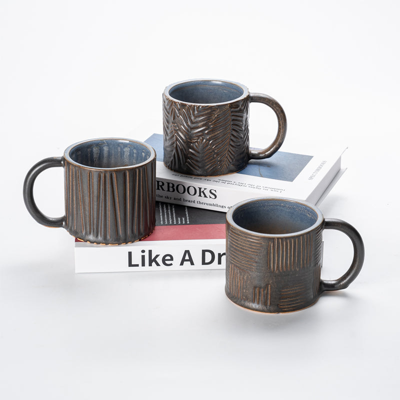The cup body is covered with matte black glaze, with a three-dimensional relief texture and various patterns on the surface. The porcelain is thick and comfortable to grip, and the cup shape is classic and practical.