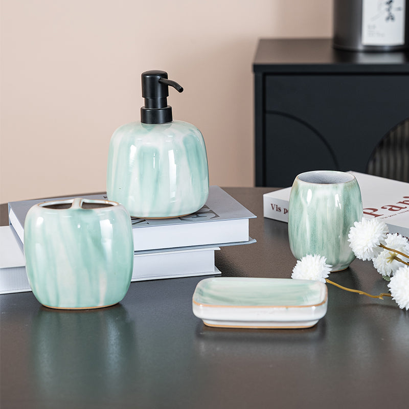 The porcelain body is dyed with a flowing cloud texture of blue glaze, and the glaze color is warm and transparent. It includes practical items such as press bottles, storage cups, soap dishes, etc., which match harmoniously.